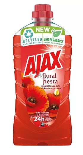Ajax Floral Fiesta Red Flowers általános felülettisztító, padlófelmosószer virág illattal (pipacs). Nagyobb felületek tisztítására higítva, makacsabb szennyeződések eltávolítására töményen is alkalmazható.