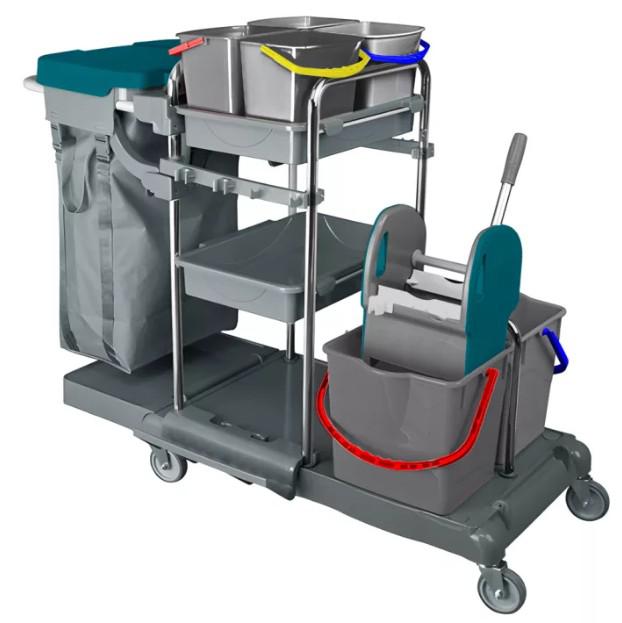 Professzionális takarítókocsi (felmosó kocsi) intézmények és irodaépületek rendszeres takarításához. A műnyag váz és acél keret kombinációjának köszönhetően könnyen mozgatható. A két db 18L-es vödör könnyen hozzáférhető és elegendő a nagyobb területek takarításához. A négy különböző színű kis vödör segítségével az eltérő területek (mosdó, konyha, stb.) takarítása sem jelent problémát, az eszköztartó kosár pedig elégséges helyet kínál a különböző tisztítószereknek és takarítóeszközöknek. A zsáktartónak köszönhetően, egyszerűen összegyűjthető a hulladék.