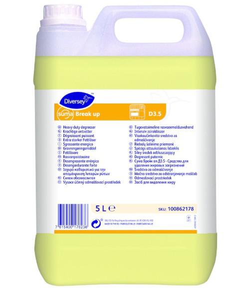 A Suma Break up D3.5 egy lúgos folyékony tisztítószer erősen szennyezett konyhai felületek (úgy, mint a padló, berendezések és tűzhelyek) kézi tisztításához. Ionos és anionos felületaktív anyagok optimális keverékét tartalmazza, melynek köszönhetően a felületet kellőképpen benedvesíti, hatékonyan eltávolítva minden fajta zsíros szennyeződést és rászáradt ételmaradékot. Egyedi összetételének köszönhetően a termék biztonságosan alkalmazható alumínium felületeken is. Alkalmazható sütők, sütőlapok, grillezők, fritőzök elzsírosodott felületeinek tisztítására, az erősen elszenesedett lerakódások eltávolítására. A Suma Break up D3.5 különösen alkalmas padlók tisztítására akár kézi mop rendszerrel.